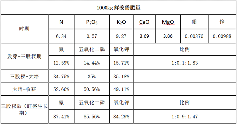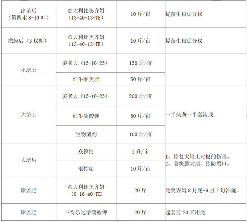(2)大、中、微量元素兼顧:大姜除對氮磷鉀的需求外,對鈣、鎂需求也很大,中量元素鈣鎂及微量元素應(yīng)早施。